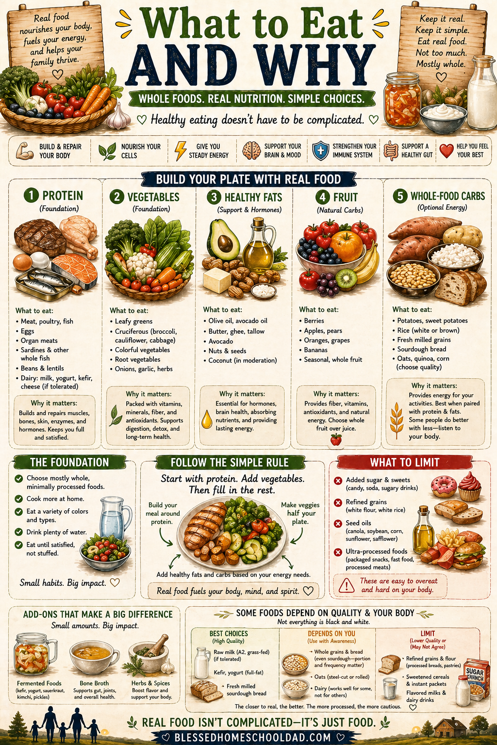 A one-page map of real food: protein, vegetables, healthy fats, fruit, and whole-food carbs. What to put on your plate, what to limit, and the simple rule for building a meal — start with protein, add vegetables, fill in the rest.