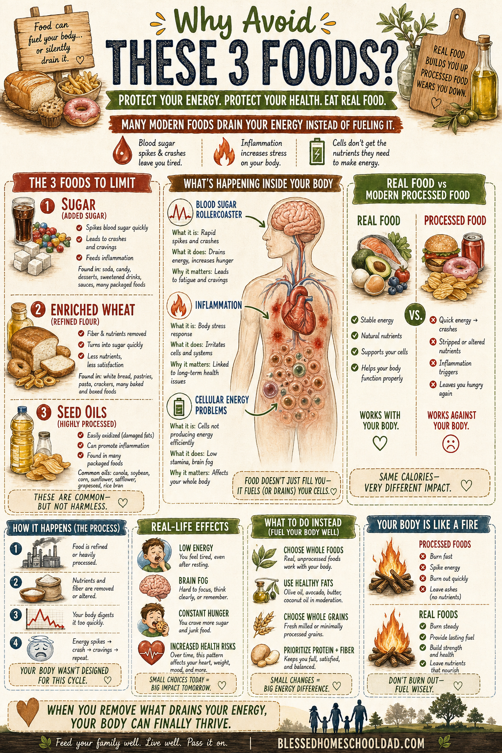 Sugar, enriched wheat, and seed oils — the three most common silent drains on a family's energy. What each one does inside your body, why it matters, and what to do instead.
