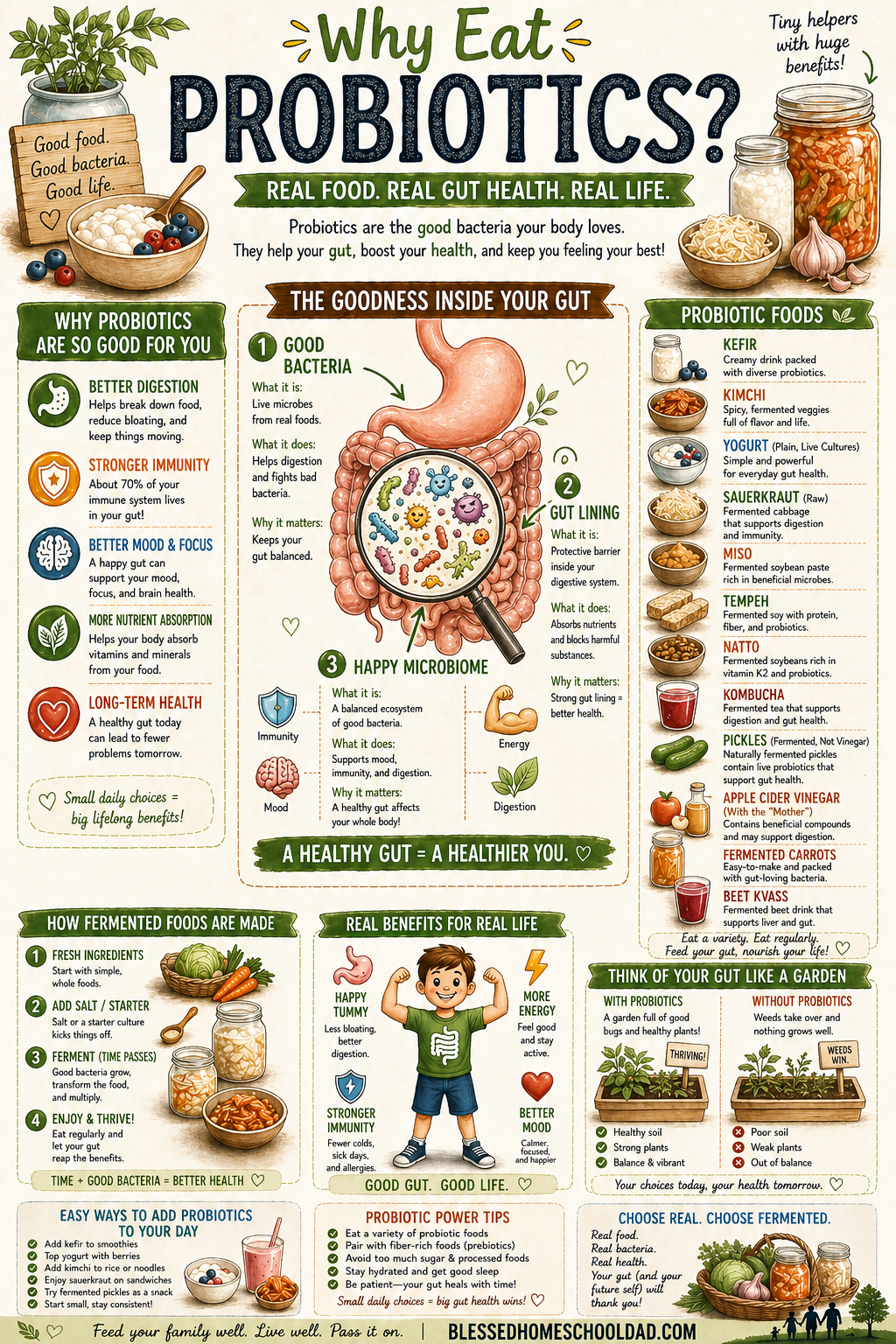 A one-page tour of the gut microbiome — why it matters, twelve real probiotic foods (kefir, kimchi, sauerkraut, miso, kombucha, and more), how fermentation works in four steps, and easy ways to add probiotics to your day. Print one for the fridge.