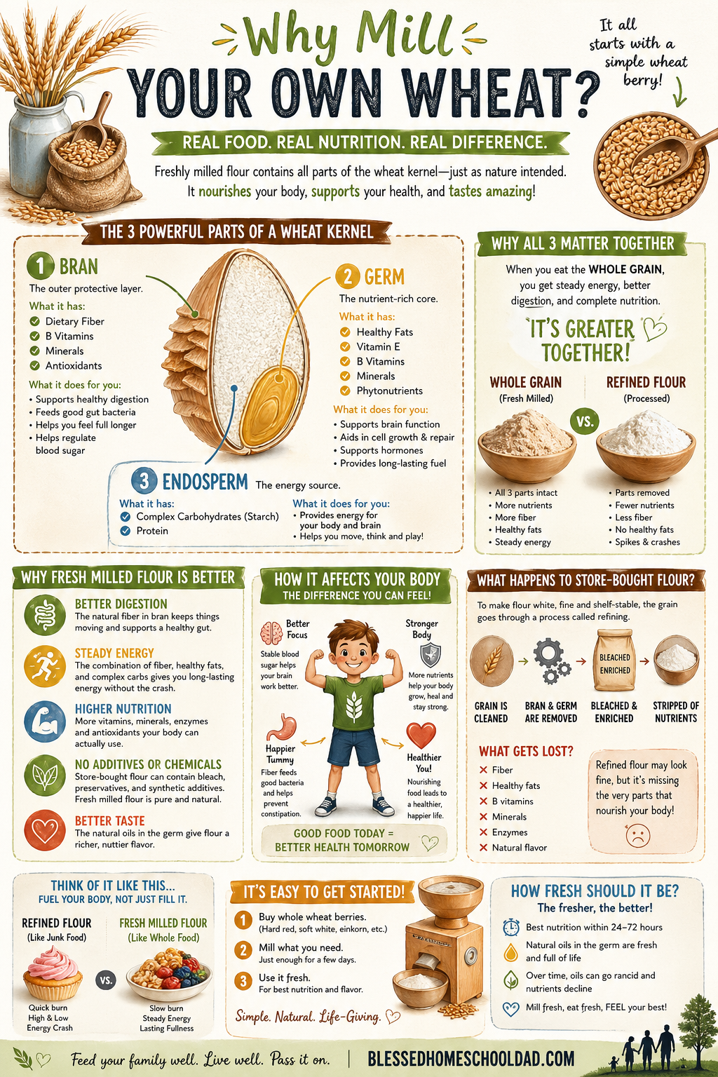 A one-page primer on the three parts of a wheat kernel — bran, germ, and endosperm — and what each one actually does for your body. Side-by-side of fresh-milled flour vs. store-bought refined, plus a simple three-step starting guide. Print and tape it to the pantry.