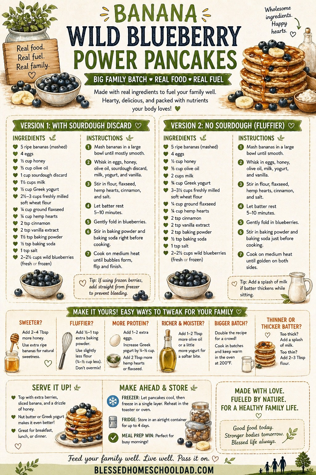 Extra-large batch built for a big family — two versions side by side: with sourdough discard, or fluffier without. Includes tweaks for sweeter, fluffier, more protein, and a freezer-friendly note. Great for breakfast or a real-food on-the-go snack.